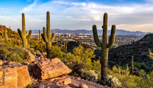 A sprawling desert landscape, showcasing prominent saguaro cacti against a backdrop of a vast city.