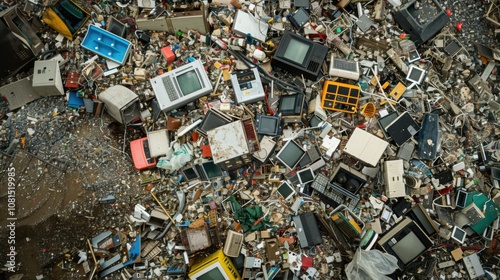 A sprawling landfill overflowing with discarded electronics and plastic waste, Portraying the issue of consumerism and waste management, photography style
