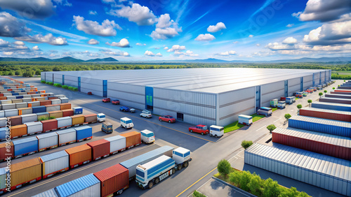 A sprawling logistics warehouse building with rows of cargo containers and trucks stands alone in a vast open yard under a bright blue sky.