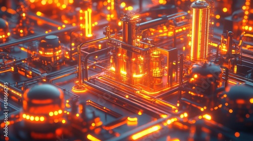 A sprawling petrochemical refinery at sunset with glowing pipelines and storage tanks.