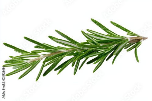 A sprig of fresh rosemary, its needle-like leaves a deep green, isolated on a white background