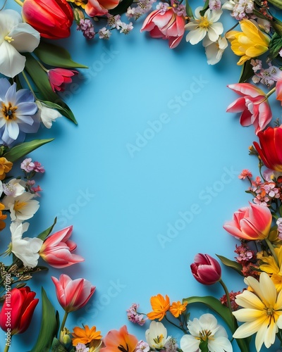 A spring flower frame on a blue backdrop offers space for text, ideal for cards or promotions.
