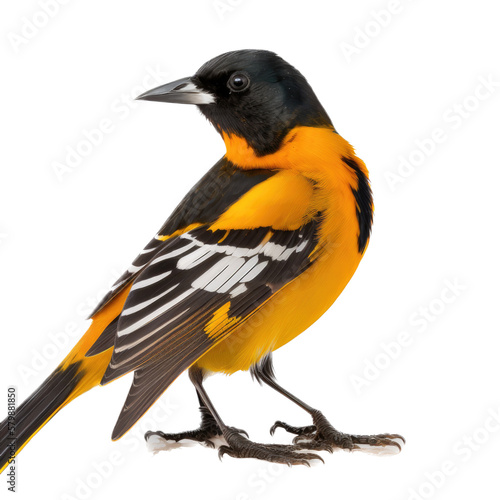 a spring-themed photographic illustration of an isolated orange and black Baltimore oriole bird at rest set on a transparent background in PNG. Generative AI