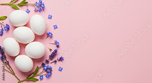 A springtime arrangement of eggs and flowers on a pastel pink background.