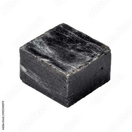 A square block of black charcoal soap with a marbled texture.