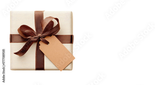 A square gift wrapped in cream paper with a dark brown satin bow and a tag