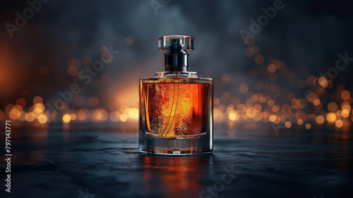 A square perfume bottle stands out against a dark background with a burst of golden bokeh lights