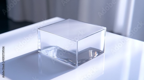 A square, transparent plastic box with glossy reflections, sitting on a polished white surface , ice on white