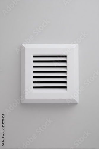 A square white air vent with horizontal slats is mounted on a wall. Ventilation, interior design, airflow, wall