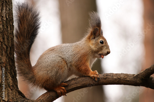 A squirrel on a tree branch holds a nut in its mouth in a natural habitat
