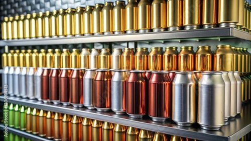 A stack of 12-24 beer cans arranged neatly on a metal shelf with a few bottles of wine and liquor nearby, shelving units, canned goods, beverage organization, cocktail parties