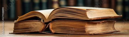 A stack of aged, open books rests on a wooden table, showcasing their worn pages and rich texture, This image is ideal for educational materials, literary blogs, or vintage-themed projects,