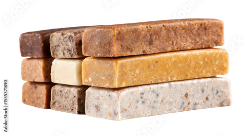 A stack of assorted natural, healthy snack bars on a white isolated background.