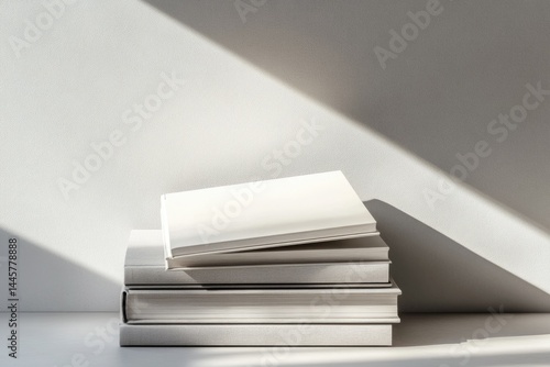 A stack of blank, light grey books sits on a white surface, bathed in sunlight.