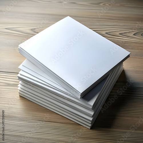 A stack of blank white papers on a wooden surface. perfect for showcasing your designs or text.