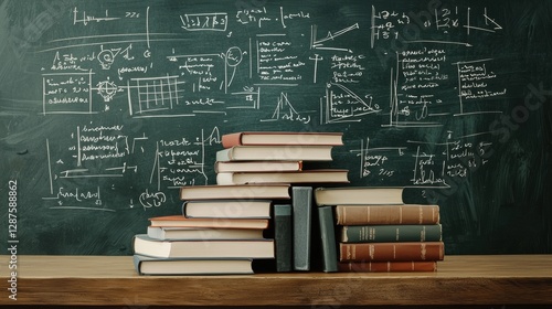 A stack of books on a table in front of a chalkboard covered with mathematical equations and diagrams.