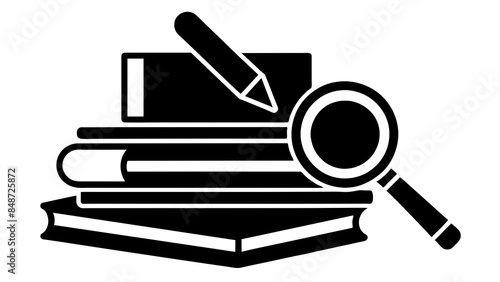 A stack of books with a magnifying glass and a pencil symbolizes knowledge, exploration, and learning. A collection of books with a magnifying glass and pencil.