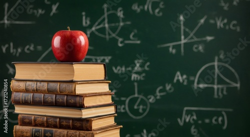 A stack of books with an apple on top in front of a chalkboard with math equations.