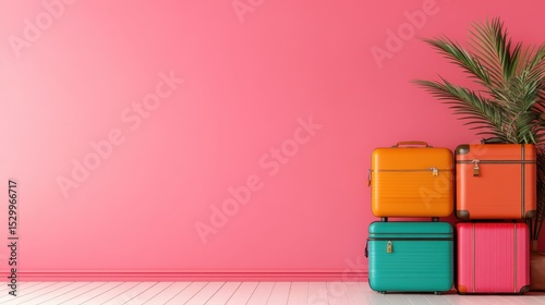 A stack of brightly colored suitcases showcases a vibrant contrast against the pink wall, embodying a playful spirit and excitement for travel and exploration.