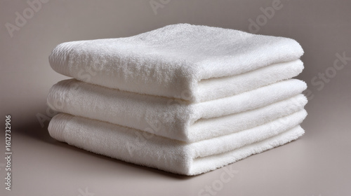 A stack of clean, fluffy white towels. A clean, minimalist shot of a perfect stack of fresh, fluffy, white spa towels on a simple, light-colored background.