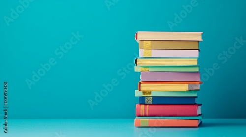 A stack of colorful books against a teal background.