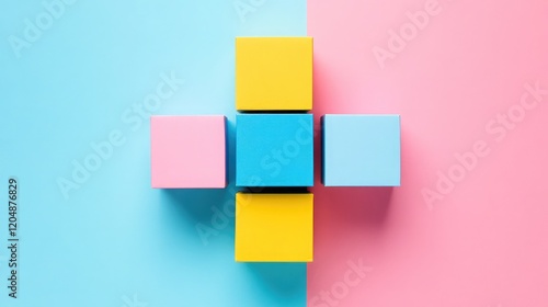 A stack of colorful packaging boxes arranged symmetrically against a vibrant background.