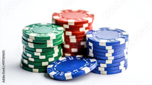 A stack of colorful poker chips arranged in groups, symbolizing gambling and gaming.