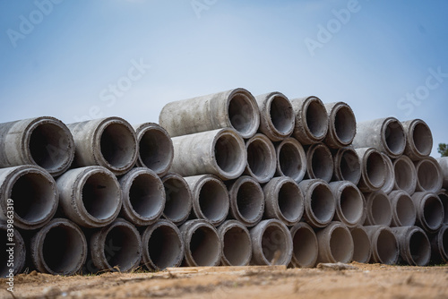 A stack of concrete ring pipes piled and creating a symmetrical arrangement