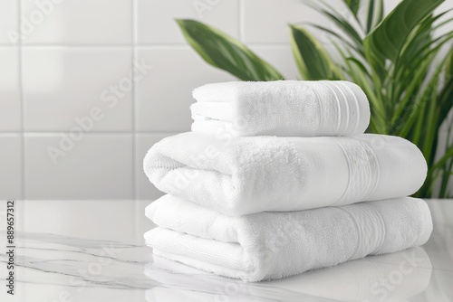 A stack of crisp white towels sits neatly on a sleek white marble countertop, evoking a sense of luxury and cleanliness. The towels are folded with precision, inviting relaxation and rejuvenation.