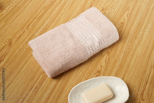 a stack of folded towels on a wooden shelf with a ladder in the background towels on wooden in bath
