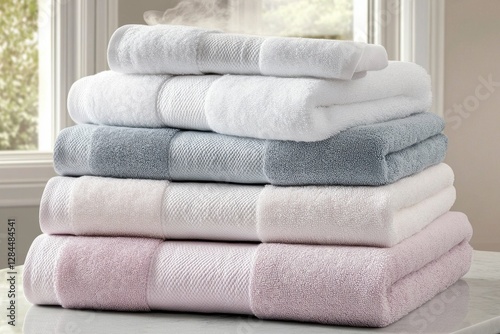 A stack of freshly laundered, soft towels, steaming slightly, in white, gray and pink colors, folded neatly on a marble countertop with a window background, creating a calming spa atmosphere.