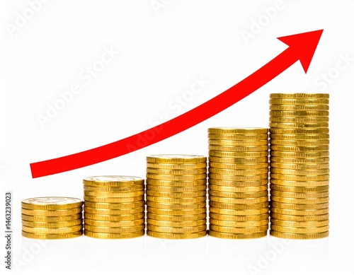 A stack of gold coins shows a rising trend, with a red arrow indicating growth and prosperity in finance or investment