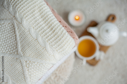 A stack of knitted sweaters, a mug of hot tea, a teapot, a wooden stand on an ottoman. Cozy autumn. Winter breakfast. Roses. Candle.