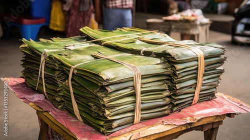 A stack of neatly arranged betel leaves waiting to be prepared into paan.