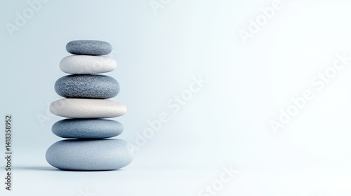A stack of smooth pebbles balanced in a minimalist composition, light blue background, serene and tranquil setting, and concept of balance and harmony.
