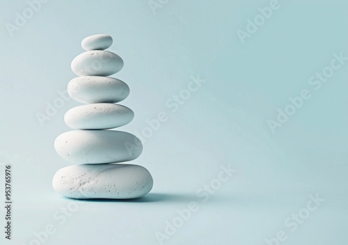 A stack of smooth, white pebbles arranged in a balanced tower on a soft blue background, symbolizing tranquility and harmony
