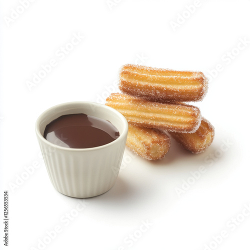 A stack of sugar-coated churros next to a cup of rich chocolate sauce on a white background, offering a delicious dessert temptation.