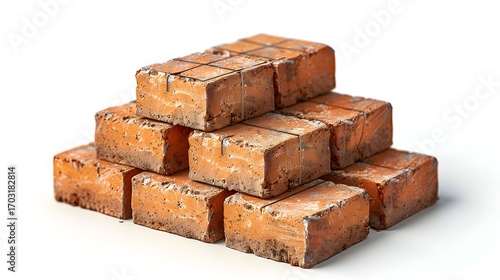 A stack of ten red clay bricks arranged in a pyramid shape on a white surface with visible details