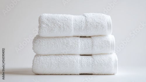 A stack of three clean white towels on a white background