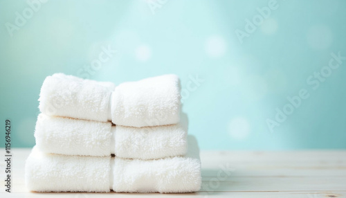 A stack of three fluffy white towels sits on a white wooden surface against a soft teal background.
