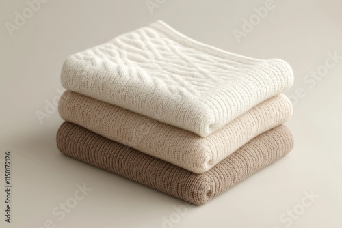 A stack of three knitted sweaters in beige, cream, and brown shades, showcasing soft textures and neutral tones.