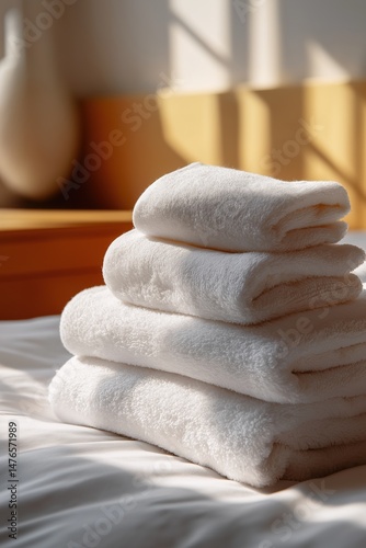 A stack of white towels on a bed. The towels are neatly folded and stacked on top of each other. Concept of cleanliness and organization, as well as a feeling of comfort and relaxation