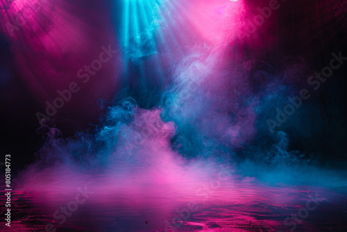 A stage shrouded in magenta smoke abstract background under a turquoise blue spotlight, providing a surreal, dreamy atmosphere against a black backdrop.