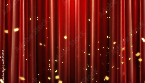 A stage with a red curtain with falling confetti. Drape curtain material. Confetti.