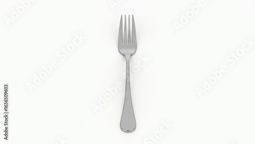 A stainless steel fork is positioned against a plain white background.