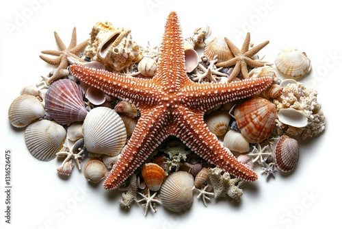 A starfish resting on the ocean floor, surrounded by colorful coral and seashells