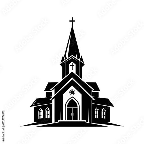 A stark black silhouette of a church, isolated on white background, its steeple reaching towards the heavens, stands as a symbol of faith and community