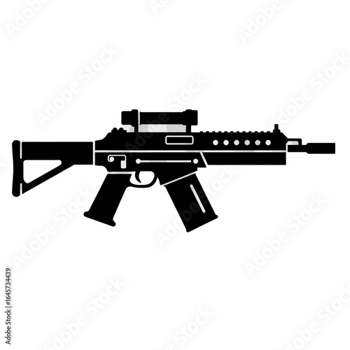 A stark white outline of a modern firearm, equipped with a top-mounted optical sight, is depicted against a deep black background, highlighting its sleek and tactical design.