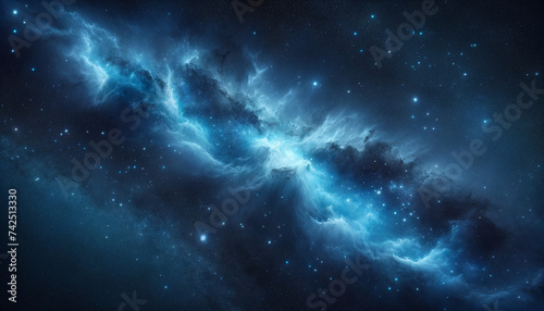 A starry night featuring a blue nebula with a soft appearance. The nebula should varying shades blue, giving glowing