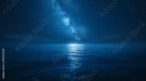 A starry night sky over a calm, dark blue ocean with the Milky Way galaxy visible.